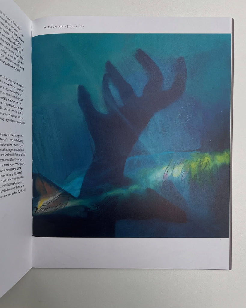 One spread that specifically caught my eye contained a photo of the oil painting The Shadow of an Animal in the Rain, part of McNab’s Our Special Gardens series, which was a response to Klint’s work. The painting depicts a shadowed hand with fingers contorted, reaching upwards in swaths of bright blue.
